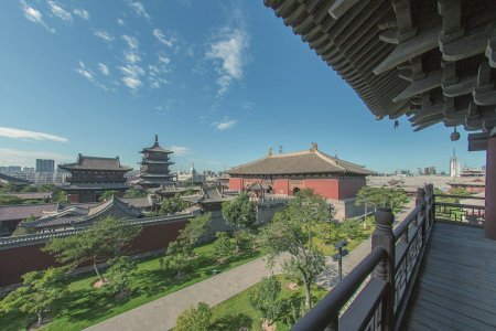 華嚴寺始建于遼重熙七年(公元1038年),其名取自佛教經(jīng)典《華嚴經(jīng)》中“慈悲之華,必結(jié)莊嚴之果”。寺院坐西向東,山門、普光明殿、大雄寶殿、薄伽教藏殿、華嚴寶塔等30余座單體建筑分別排列在南北兩條主軸線上,布局嚴謹,規(guī)模宏大,占地面積達6.6萬平方米,是我國現(xiàn)存年代較早、保存較完整的一座遼金寺廟建筑群,1961年被國務(wù)院公布為第一批全國重點文物保護單位,2014年被評為國家4A級旅游景區(qū)。