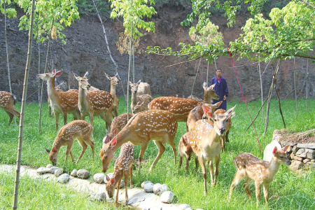 基地采用“公司+基地+合作社+農戶”的經營模式,鼓勵和扶持農戶認養(yǎng)梅花鹿和種植農作物,并以訂單式回收,確保農戶收益。上桑林村村民劉海軍四年前認養(yǎng)了兩頭鹿,每年每頭鹿凈增收4000多元?!拔艺J養(yǎng)的是公鹿,村里認養(yǎng)母鹿的收入更多,畢竟生下的小鹿都是個人的。還有在基地上班的也不少掙。”