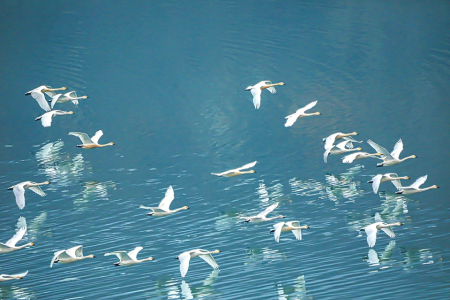 不只是桃河。近年來,在陽泉,龍華口水庫、平定縣二電廠調蓄水庫、尚怡水庫等河流匯集、水面寬廣的地方,經常有天鵝、白鷺、鴛鴦、黑鸛、野鴨等各種野生鳥類出現。碧水長流,這些美麗的精靈逐水飛翔嬉戲,構成一幅生機勃勃的春日畫卷。