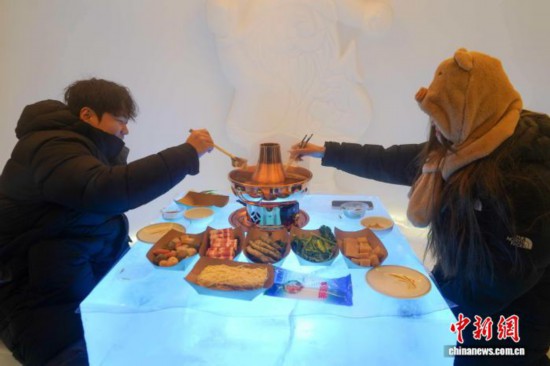 在用雪打造的屋子里,羊肉片、凍豆腐、青菜拼盤等食材已經(jīng)擺好,陸續(xù)有游客前來(lái)體驗(yàn)雪屋火鍋的“冷熱交替”?!巴饷媪阆露?,吃著沸騰的火鍋很刺激?!北本┯慰蛣⒉┛≌f(shuō)。