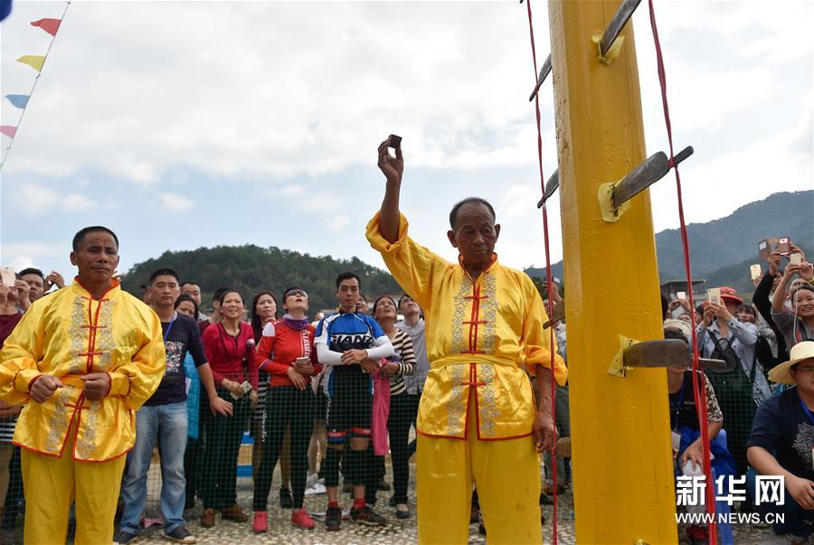 農(nóng)歷十月十五前后,福建西部武平縣各山村陸續(xù)進入農(nóng)閑時節(jié)。按照當?shù)仫L俗,不同村子各自擇日舉辦民間活動,其中較有代表性的就是“上刀山”絕技?!吧系渡健苯^技在閩西山村流傳已有數(shù)百年歷史,表演者需光腳順著磨得鋒利閃亮的36把鋼刀,攀登至8米高的杉木柱子頂部,接受長者祝福,祈求風調(diào)雨順、五谷豐登。新華社記者 宋為偉 攝