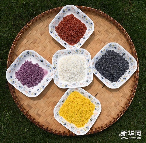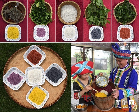 上五圖:4種不同植物及其色素染成的糯米和原色糯米;下左圖:4種不同植物色素染成的糯米和原色糯米;下右圖:在廣西上林縣巷賢鎮(zhèn),兩名壯族村民在查看一桶剛剛蒸熟的五色糯米飯(拼版圖片,3月25日攝)。 每年“壯族三月三”到來之際,廣西的壯族同胞都有蒸制五色糯米飯迎接節(jié)日的習(xí)俗,以祈禱五谷豐登,五福臨門。這些五色糯米飯,主要采用天然植物萃取色素,將糯米分別浸泡到紫、黃、紅、黑4種不同植物色素的水里,充分染色后,與原色糯米一起蒸熟而成。色澤鮮艷、清香誘人的五色糯米飯,是“壯族三月三”接待來客時必不可少的傳統(tǒng)美食。新華社記者 陸波岸 攝