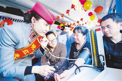 列車工作人員為旅客量血壓/人民日報記者賀勇攝