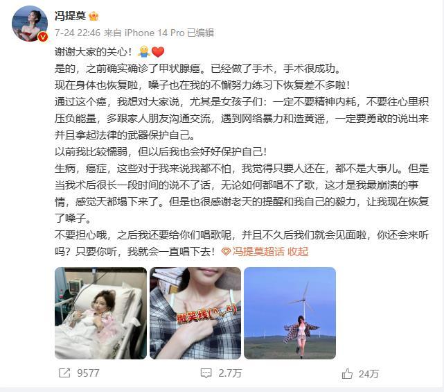 前不久,歌手馮提莫在微博發(fā)文稱自己患甲狀腺癌,經(jīng)手術(shù)已恢復(fù)。她說(shuō),通過(guò)這個(gè)癌,想對(duì)大家說(shuō),尤其是女孩子們,一定不要精神內(nèi)耗,不要往心里積壓負(fù)能量。