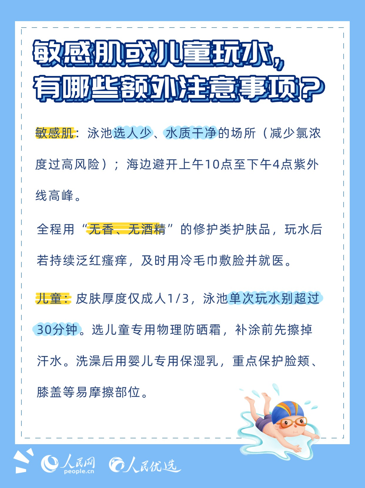 夏日炎炎,無論是泳池里的清涼暢游,還是海邊的逐浪嬉戲,都是驅(qū)散暑氣的不錯選擇。但玩水的快樂背后,卻藏著不少傷害皮膚的“陷阱”——泳池的消毒劑、海邊的強紫外線、海水中的高鹽分,稍有不慎就可能引發(fā)皮膚干燥、泛紅、曬黑、長斑甚至曬傷。本期《人民優(yōu)選來了》教你掌握科學的護膚方法,讓你在享受玩水樂趣的同時,保持健康的肌膚狀態(tài)。