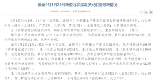 截至9月1日24時,據(jù)31個?。ㄗ灾螀^(qū)、直轄市)和新疆生產(chǎn)建設(shè)兵團(tuán)報告,現(xiàn)有確診病例198例(其中重癥病例3例),累計(jì)治愈出院病例80234例,累計(jì)死亡病例4634例,累計(jì)報告確診病例85066例,無現(xiàn)有疑似病例。累計(jì)追蹤到密切接觸者816307人,尚在醫(yī)學(xué)觀察的密切接觸者7587人。