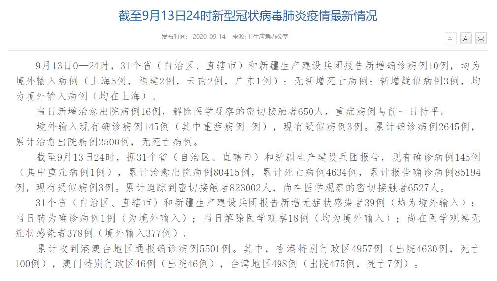 人民網(wǎng)北京9月14日(董童)國家衛(wèi)生健康委于今日在官網(wǎng)發(fā)布的《截至9月13日24時新型冠狀病毒肺炎疫情最新情況》(以下簡稱“情況”)提出,9月13日0—24時,31個?。ㄗ灾螀^(qū)、直轄市)和新疆生產(chǎn)建設兵團報告新增確診病例10例,均為境外輸入病例(上海5例,福建2例,云南2例,廣東1例);無新增死亡病例;新增疑似病例3例,均為境外輸入病例(均在上海)。當日新增治愈出院病例16例,解除醫(yī)學觀察的密切接觸者650人,重癥病例與前一日持平。