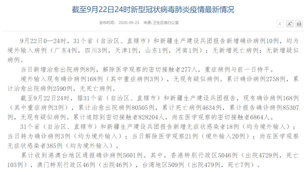 截至9月22日24時,據(jù)31個省(自治區(qū)、直轄市)和新疆生產(chǎn)建設(shè)兵團(tuán)報告,現(xiàn)有確診病例168例(其中重癥病例3例),累計治愈出院病例80505例,累計死亡病例4634例,累計報告確診病例85307例,無現(xiàn)有疑似病例。累計追蹤到密切接觸者828204人,尚在醫(yī)學(xué)觀察的密切接觸者6864人。