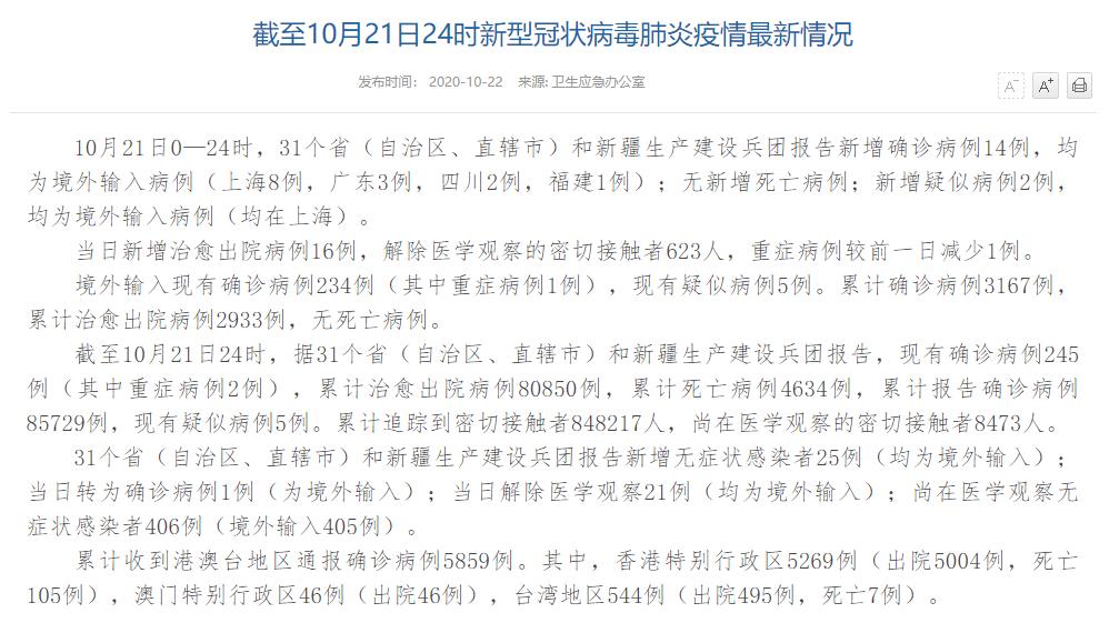情況顯示,截至10月21日24時,據(jù)31個?。ㄗ灾螀^(qū)、直轄市)和新疆生產(chǎn)建設(shè)兵團報告,現(xiàn)有確診病例245例(其中重癥病例2例),累計治愈出院病例80850例,累計死亡病例4634例,累計報告確診病例85729例,現(xiàn)有疑似病例5例。累計追蹤到密切接觸者848217人,尚在醫(yī)學觀察的密切接觸者8473人。