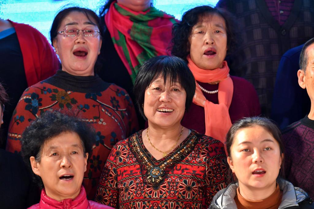 ↑1月3日,在山西省渾源縣荊莊村,渾源縣貧困山區(qū)合唱團(tuán)在表演合唱《紅梅贊》。