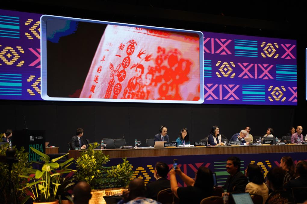 12月4日,在巴拉圭亞松森聯(lián)合國(guó)教科文組織保護(hù)非物質(zhì)文化遺產(chǎn)政府間委員會(huì)第19屆常會(huì)評(píng)審現(xiàn)場(chǎng),大屏幕播放春節(jié)宣傳視頻。新華社記者 朱雨博 攝