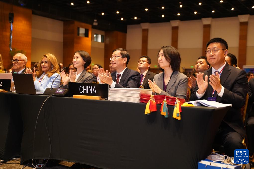 12月4日,在巴拉圭亞松森拍攝的聯(lián)合國(guó)教科文組織保護(hù)非物質(zhì)文化遺產(chǎn)政府間委員會(huì)第19屆常會(huì)評(píng)審現(xiàn)場(chǎng),中國(guó)代表團(tuán)慶祝春節(jié)申遺成功。新華社記者 朱雨博 攝
