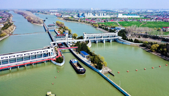 位于江蘇省揚州市江都區(qū)的南水北調東線一期工程運鹽閘、邵仙套閘、邵仙閘洞(2024年3月19日攝,無人機照片)。新華社發(fā)(任飛攝)