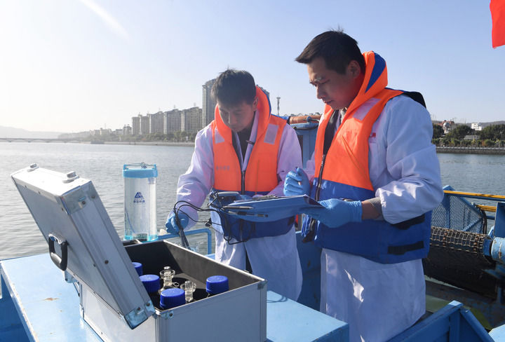在丹江口庫區(qū)河南淅川縣鸛河流域城區(qū)段,南陽市生態(tài)環(huán)境局淅川分局工作人員記錄采樣水質情況(2024年11月28日攝)。新華社記者 郝源 攝