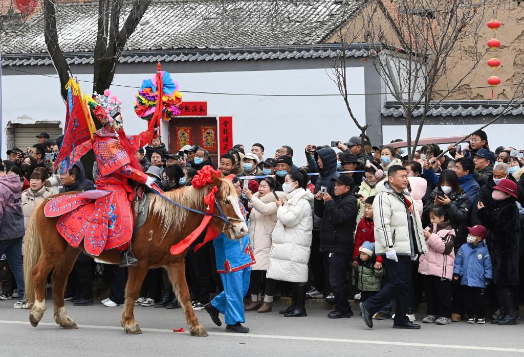 2月12日,游客在隴縣元宵節(jié)社火巡游活動上觀看馬社火表演。 新華社記者 鄒競一 攝