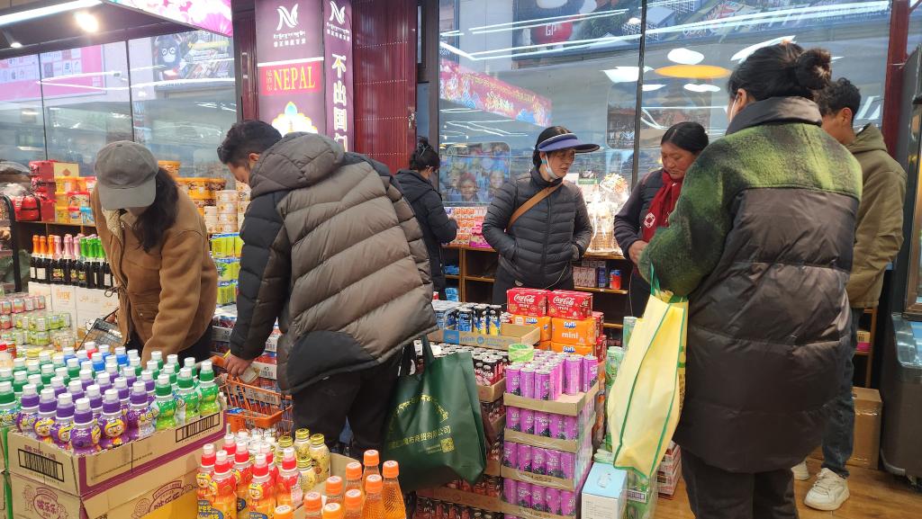 次仁卓瑪?shù)膬鹤釉鲃t負(fù)責(zé)到附近的進(jìn)口超市購(gòu)買(mǎi)孩子們喜歡的年貨?!拔屹I(mǎi)了些進(jìn)口的餅干和巧克力,都是些新鮮玩意兒,小孩子喜歡,過(guò)年也好招待親戚朋友們。”扎西說(shuō)著,又將兩提來(lái)自國(guó)外的飲料放進(jìn)了購(gòu)物推車(chē)。