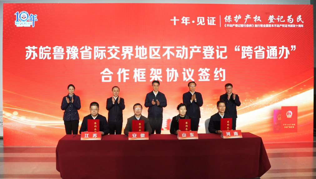 2025年3月1日,《不動(dòng)產(chǎn)登記暫行條例》施行暨全國首本不動(dòng)產(chǎn)權(quán)證書頒發(fā)十周年。在首證頒發(fā)地江蘇省徐州市舉辦的現(xiàn)場活動(dòng)上,蘇皖魯豫省際交界地區(qū)合作再擴(kuò)容,四省十市正式簽訂框架協(xié)議,啟動(dòng)不動(dòng)產(chǎn)登記“跨省通辦”合作。