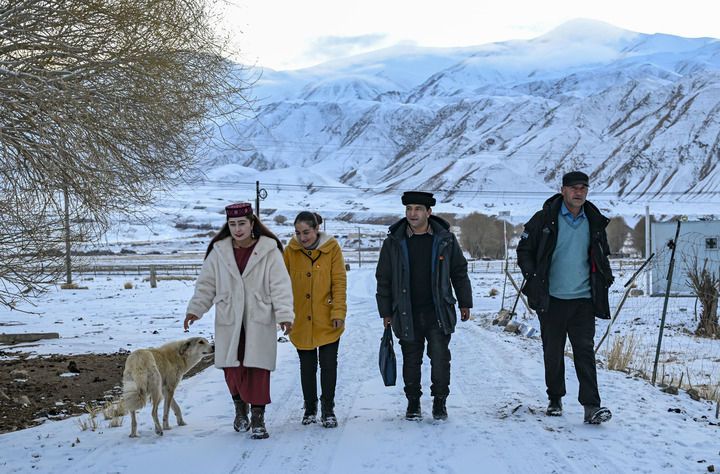 2025年1月3日,全國(guó)人大代表多來(lái)提曼·開(kāi)米克(右二)在新疆塔什庫(kù)爾干塔吉克自治縣瓦恰鄉(xiāng)夏布孜喀拉村走訪。新華社記者 陳朔 攝