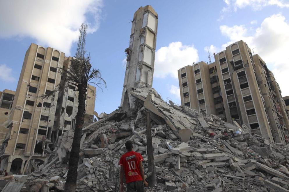 ??2024年7月26日,在加沙地帶中部努賽賴特難民營,一名男子查看一片建筑廢墟。新華社發(fā)(馬爾萬·達烏德攝)