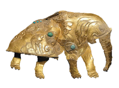 血渭一號(hào)墓出土的鑲綠松石金象飾片(中國(guó)社科院考古所供圖)