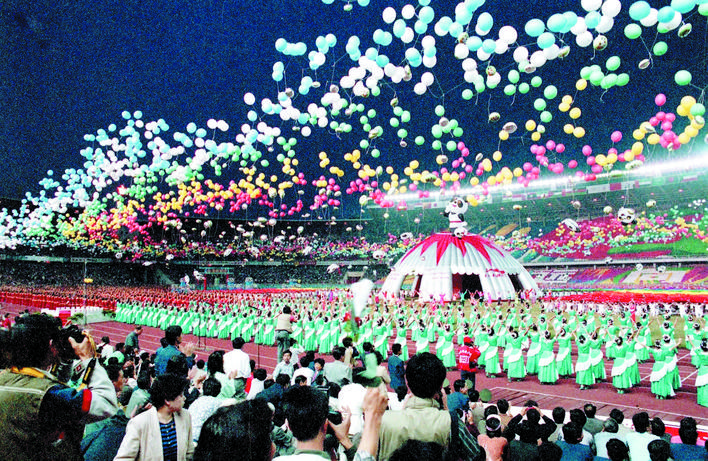 1990年9月22日至10月7日,第十一屆亞運會在北京舉行。這是中國首次舉辦國際綜合性運動會。圖為開幕式現(xiàn)場。 新華社發(fā)