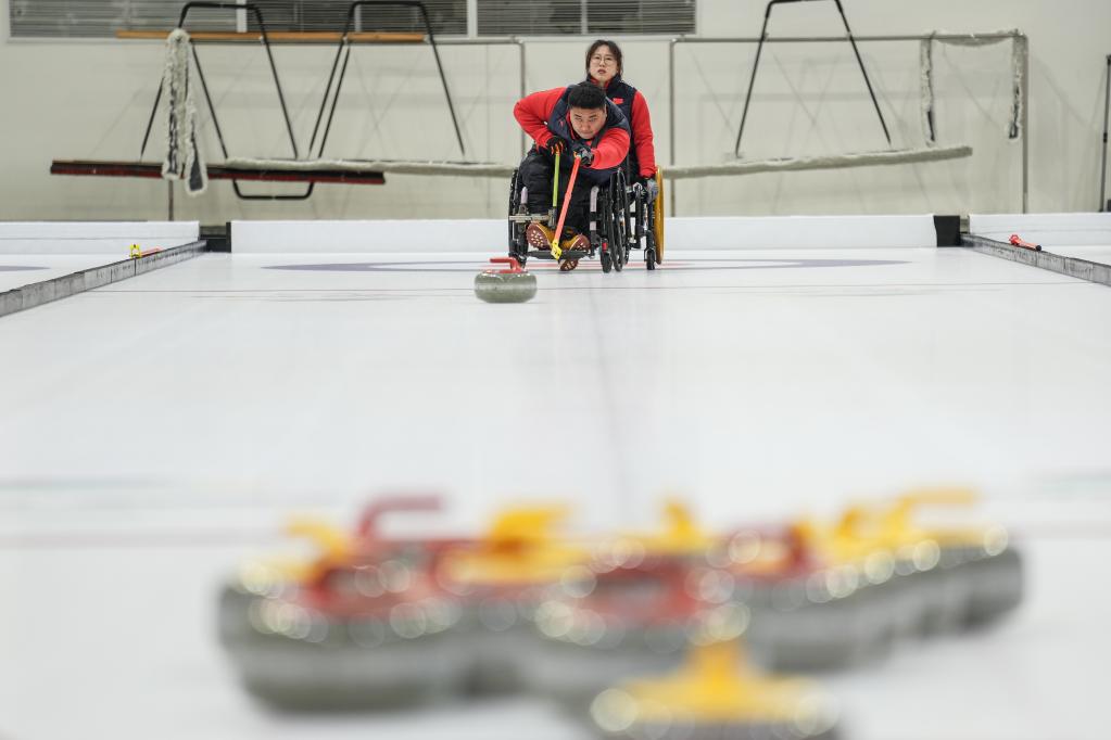 輪椅冰壺運(yùn)動(dòng)員王海濤(前)在國(guó)家殘疾人冰上運(yùn)動(dòng)比賽訓(xùn)練館投壺。新華社記者彭子洋攝