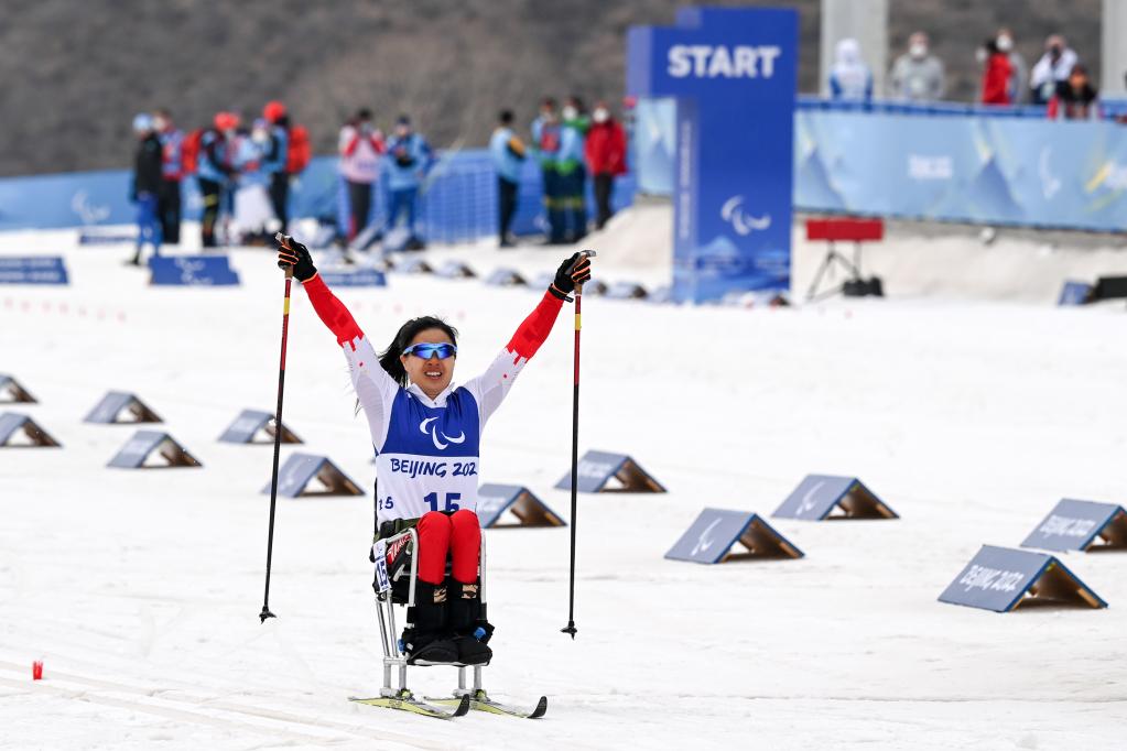 3月9日,中國楊洪瓊獲得北京冬殘奧會殘奧越野滑雪女子短距離(坐姿)冠軍。新華社記者李博攝