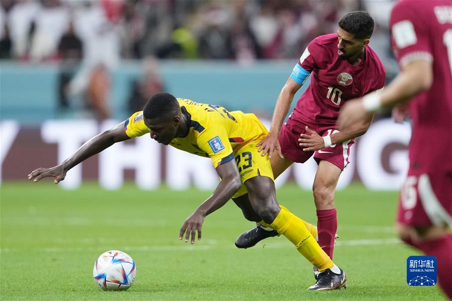 11月20日,厄瓜多爾隊(duì)球員莫伊塞斯·凱塞多(左)與卡塔爾隊(duì)球員哈?!ず6嗨乖诒荣愔衅磽?。新華社記者 鄭煥松 攝