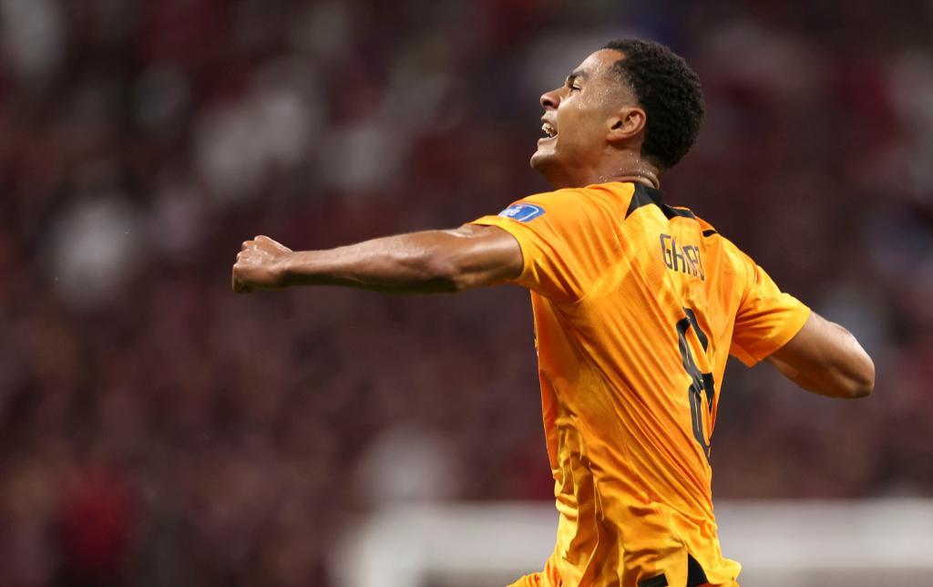 11月29日,荷蘭隊球員科迪·加克波在比賽中進(jìn)球后慶祝。新華社記者 徐子鑒 攝