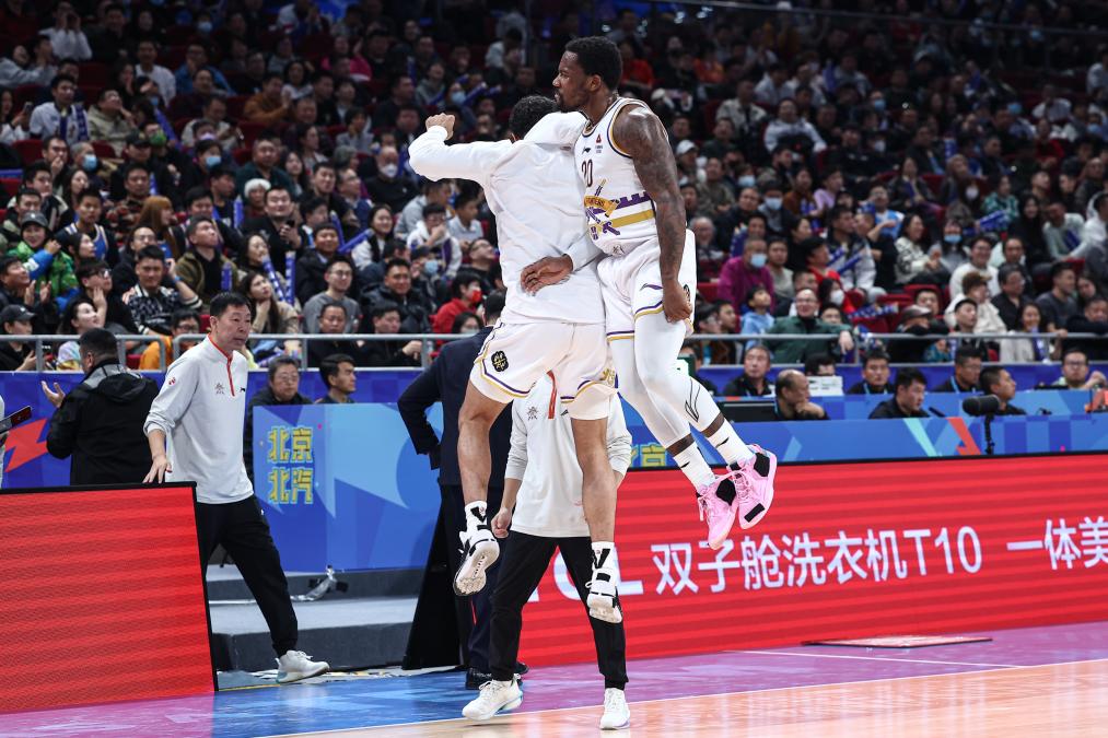 11月15日,北控隊球員費爾德(右)與隊友在比賽中慶祝。新華社記者 吳壯 攝