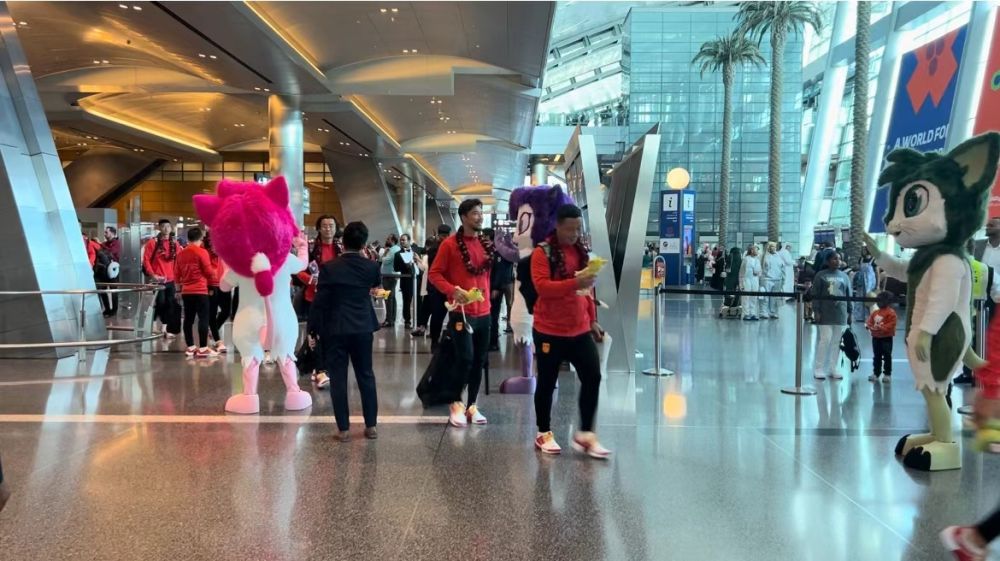 抵達(dá)多哈哈馬德國(guó)際機(jī)場(chǎng)時(shí),中國(guó)隊(duì)整體狀態(tài)顯得較為放松,多名教練員和球員主動(dòng)與亞洲杯吉祥物擊掌。