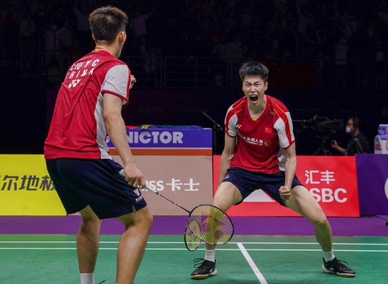 2023年5月20日,中國隊(duì)組合劉雨辰/歐烜屹(右)在2023年蘇迪曼杯世界羽毛球混合團(tuán)體錦標(biāo)賽半決賽男雙比賽后慶祝。新華社記者李博攝