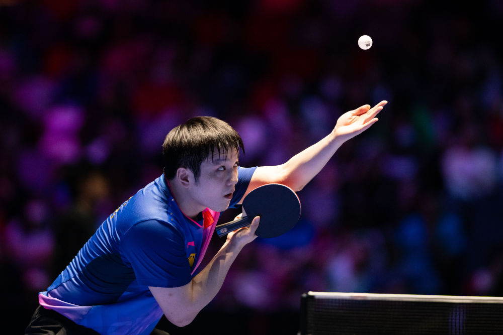4月18日,樊振東在比賽中發(fā)球。新華社記者 張金加 攝