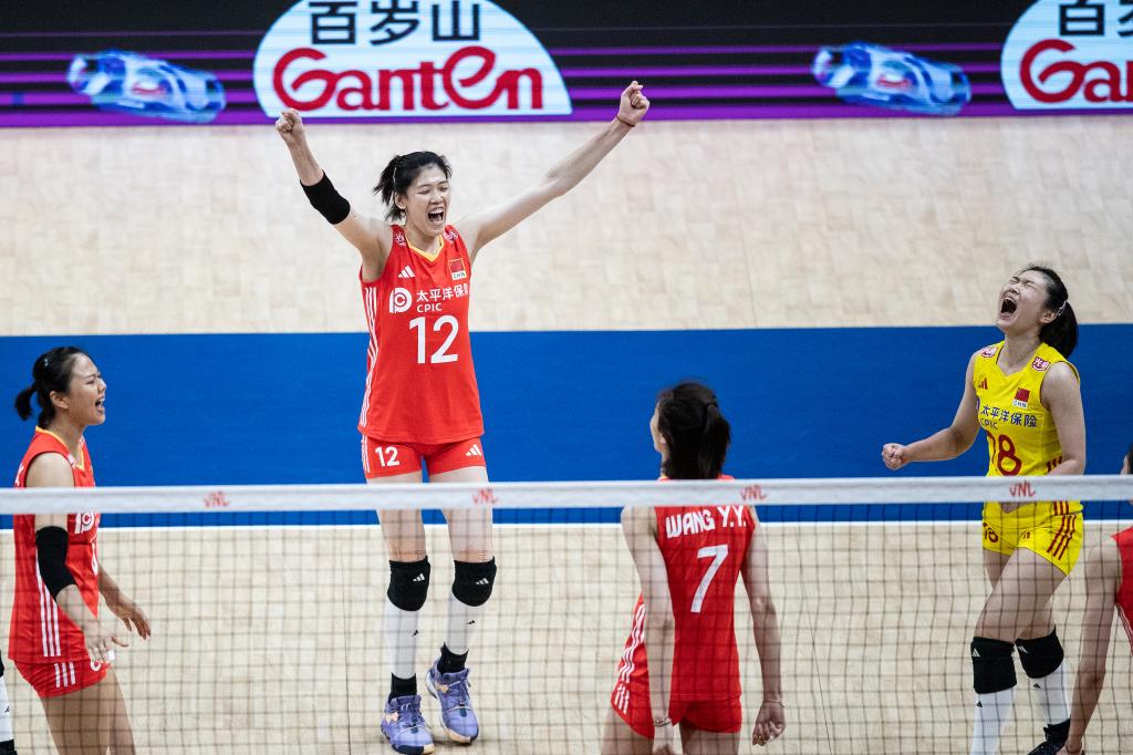 5月16日,中國隊球員在比賽中慶祝得分。新華社記者 王天聰 攝