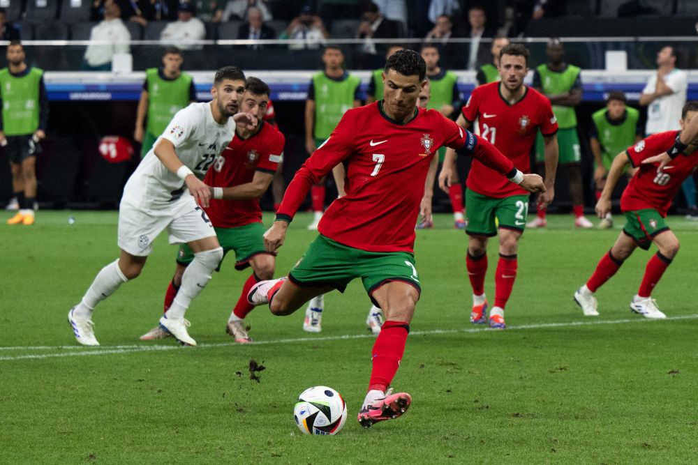 雙方在常規(guī)時(shí)間內(nèi)都沒(méi)能攻破對(duì)方大門(mén),但C羅原本有機(jī)會(huì)在加時(shí)賽中打進(jìn)致勝進(jìn)球,但他在加時(shí)賽上半場(chǎng)的點(diǎn)球被對(duì)方門(mén)將奧布拉克撲出。失點(diǎn)后的C羅傷心流淚,隊(duì)友及教練團(tuán)隊(duì)紛紛上前安慰,現(xiàn)場(chǎng)的葡萄牙球迷也大喊著“Viva Ronaldo”為這位已經(jīng)39歲的老將打氣。