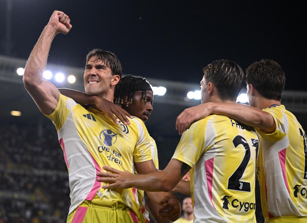 8月26日,尤文圖斯隊(duì)球員弗拉霍維奇(左)與隊(duì)友慶祝本場(chǎng)第二粒進(jìn)球。新華社發(fā)(阿爾貝托·林格利亞攝)