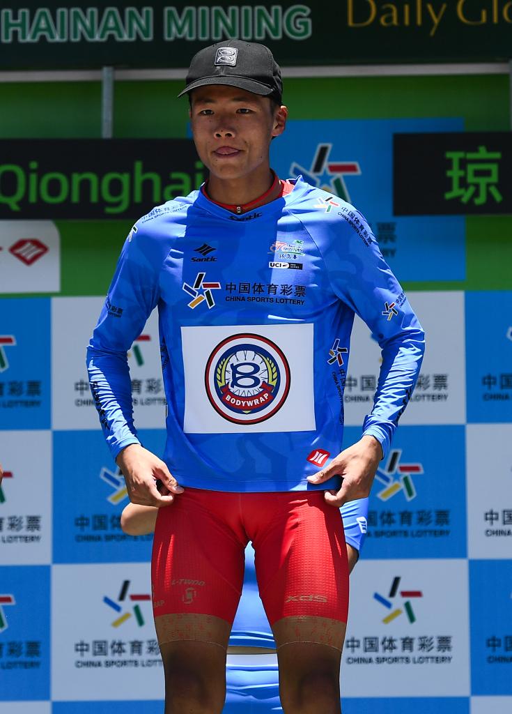 8月27日,巴迪瑞洲際車隊(duì)車手王奎程獲得代表亞洲最佳個(gè)人成績(jī)的藍(lán)衫。新華社記者 楊冠宇 攝