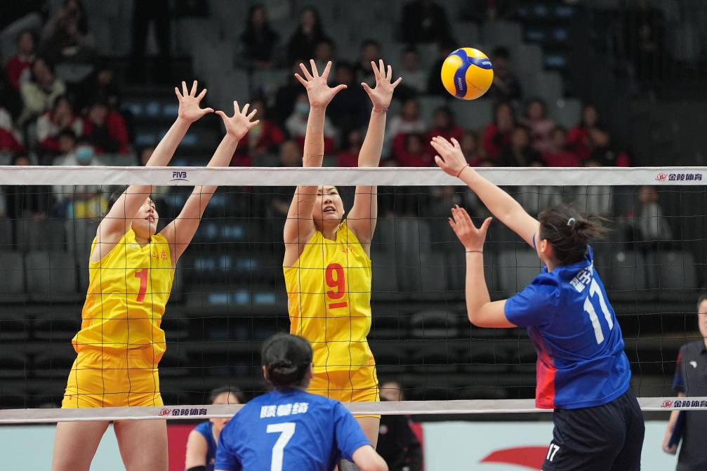 11月27日,山東隊(duì)球員李晨瑄(中)、李美君(左)在比賽中攔網(wǎng)。當(dāng)日,在湖南省長沙市賀龍?bào)w育館舉行的中華人民共和國第一屆青少年三大球運(yùn)動(dòng)會(huì)排球女子決賽中,山東隊(duì)3比0戰(zhàn)勝江蘇隊(duì),獲得冠軍。新華社記者 薛宇舸 攝