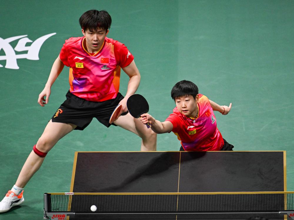 12月8日,中國隊組合王楚欽/孫穎莎(右)在混雙比賽中。新華社記者 王曦 攝