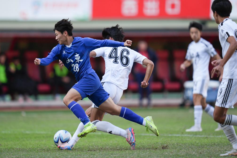 11月27日,山東隊球員陳子涵(左一)在比賽中進(jìn)攻。當(dāng)日,在第一屆青少年三大球運動會足球項目男子金牌賽中,山東隊1:0勝上海隊,奪得冠軍。新華社記者 薛宇舸 攝