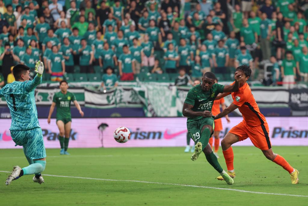 6月30日,北京國(guó)安隊(duì)球員法比奧(右二)在比賽中射門得分。新華社記者 胡星宇 攝
