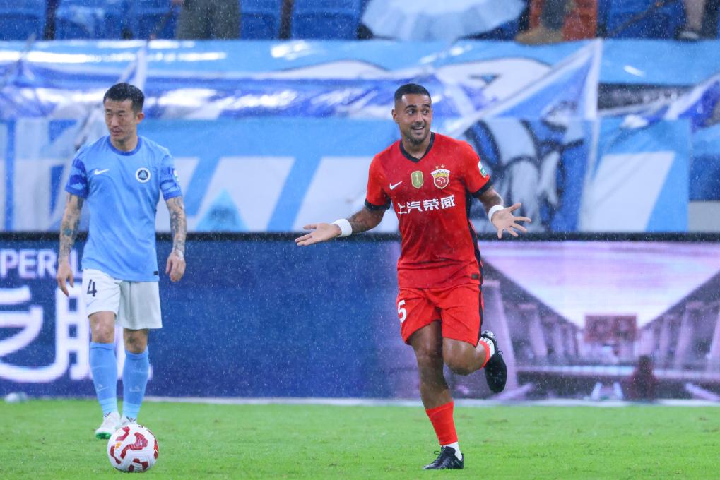 6月30日,上海海港隊(duì)球員萊昂納多(右)在比賽中慶祝進(jìn)球。新華社發(fā)(彭志剛 攝)