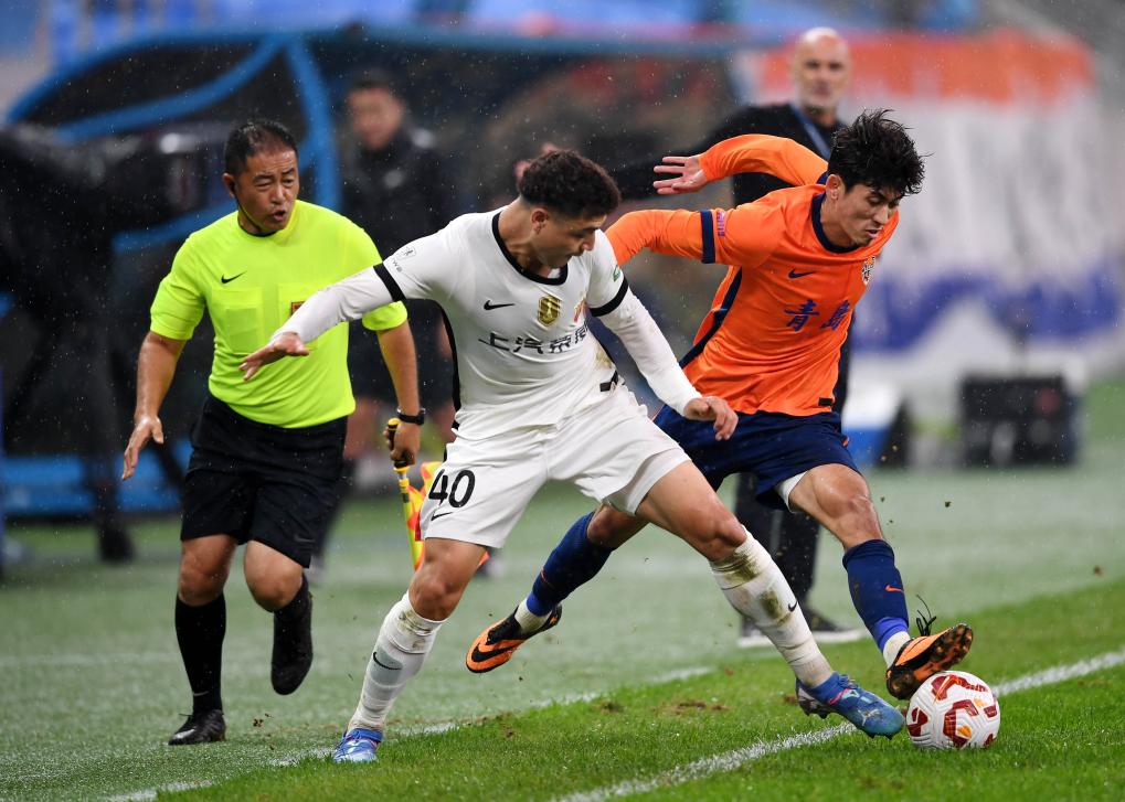 10月17日,上海海港隊(duì)球員吾米提江·玉蘇普(前左)在比賽中與青島海牛隊(duì)球員買烏郎·米吉提拼搶。當(dāng)日,在山東青島舉行的2025賽季中超聯(lián)賽第27輪比賽中,上海海港隊(duì)客場4:3戰(zhàn)勝青島海牛隊(duì)。新華社記者 李紫恒 攝