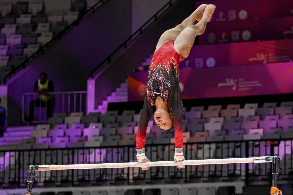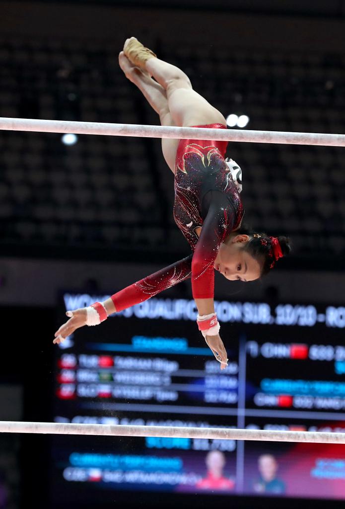 10月21日,中國選手張清穎在高低杠項目比賽中。新華社發(fā)(阿貢·昆卡亞攝)
