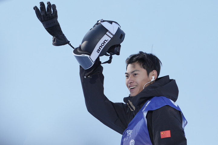 11月27日,中國單板滑雪運(yùn)動(dòng)員蘇翊鳴在資格賽晉級(jí)后慶祝。新華社記者 盧星吉 攝