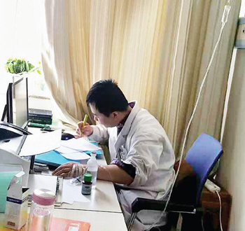 3月10日起,在微信朋友圈里,這張醫(yī)生掛吊瓶接診的照片引起了很多人的關(guān)注。照片中一名身穿白大褂的醫(yī)生正在值班室埋頭寫病歷,他的一只手上正輸著液體。筆者了解到,是一名病人的家屬上傳了這張照片。他的父親十幾天前曾在中醫(yī)院9樓心血管病房住院,在父親住院的一天,他去值班室詢問父親病情時,看到了徐強(qiáng)醫(yī)生打吊瓶堅持工作,這讓他十分感動,于是就悄悄用手機(jī)拍了照并上傳至微信朋友圈。