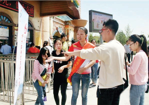 會后,工作人員在景區(qū)內(nèi)張貼了忻州申辦“2016年山西省旅游發(fā)展大會”投票海報(bào),并為游客講解活動內(nèi)容及投票方法,倡導(dǎo)人人助力、人人投票。圖為工作人員為游客講解投票事宜(忻仁)