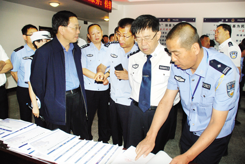 參加現(xiàn)場(chǎng)會(huì)的副市長(zhǎng)武憲堂、省公安廳交管局局長(zhǎng)賈繼武、市公安局副局長(zhǎng)、交警支隊(duì)長(zhǎng)袁小波等領(lǐng)導(dǎo),在偏關(guān)縣公安局交警大隊(duì)觀摩(張軍 攝)