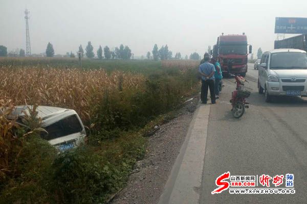 9月16日下午13時(shí)左右,在忻州東外環(huán)108國(guó)道北肖村段,一輛大貨車發(fā)生追尾,將路邊停放的面包車撞到了溝里,所幸車內(nèi)無人,未造成人員傷亡。(韓偉)