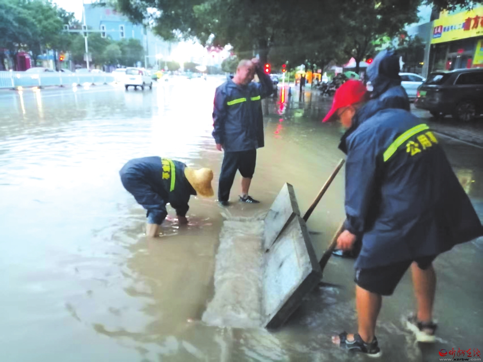 市城市管理局干部職工清理被堵塞的排水井口。本報(bào)記者 張志遠(yuǎn)攝
